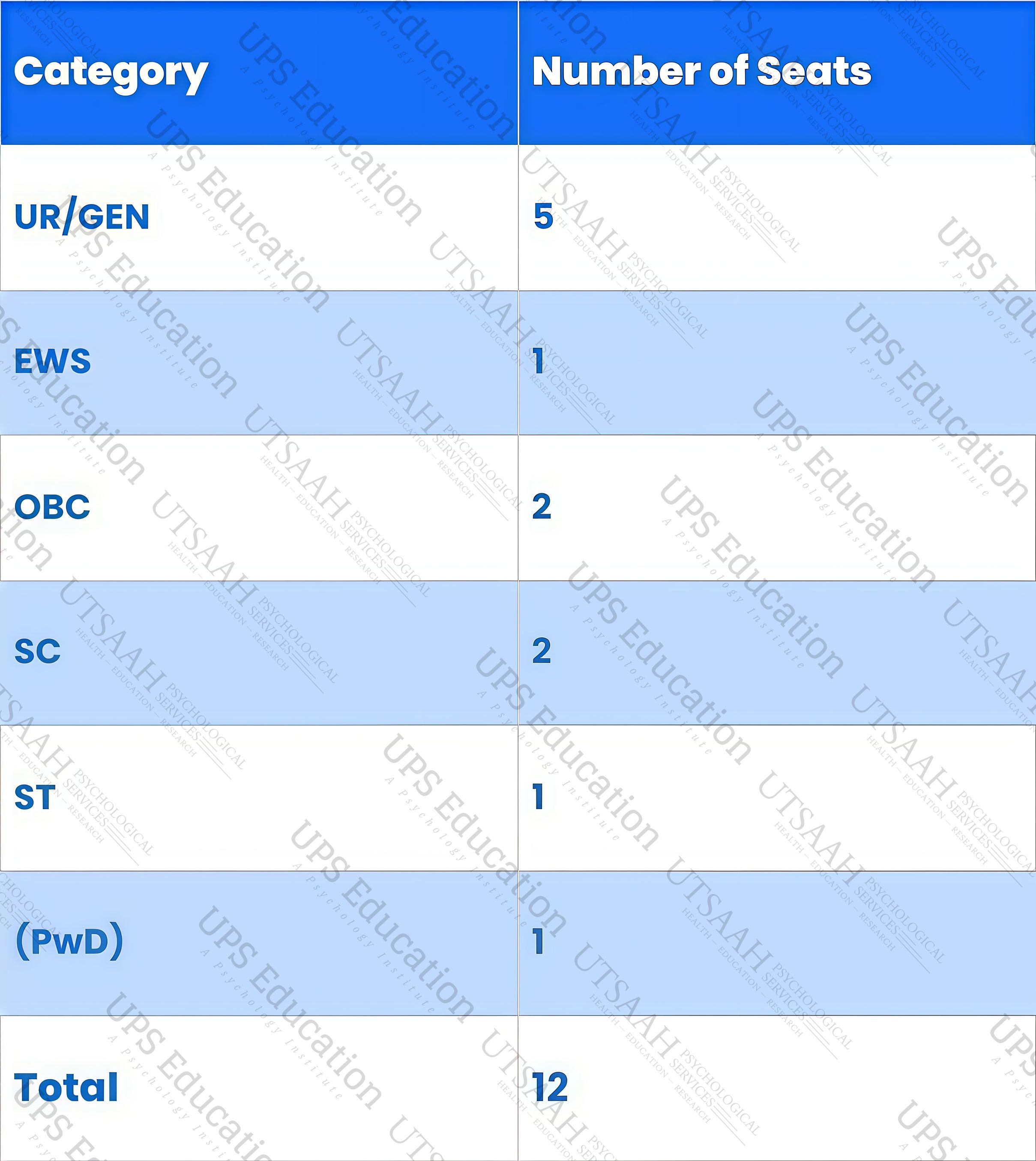 The duration of the MA Clinical Psychology (RCI) program at IHBAS Delhi is 2 Years and offers a total of 12 seats (subject to change every year). Following is a classification of seats by the categories: