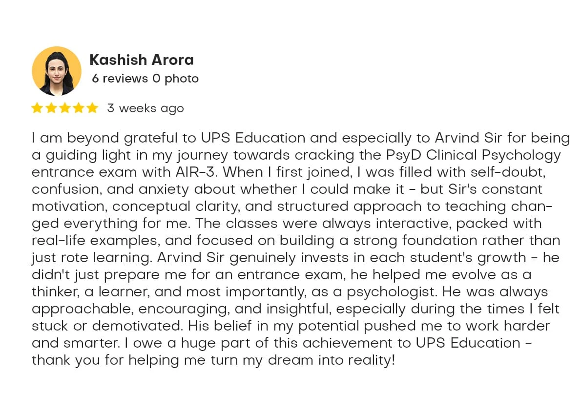I am beyond grateful to UPS Education and especially to Arvind Sir for being a guiding light in my journey towards cracking the PsyD Clinical Psychology entrance exam with AIR-3. When I first joined, I was filled with self-doubt, confusion, and anxiety about whether I could make it — but Sir’s constant motivation, conceptual clarity, and structured approach to teaching changed everything for me. The classes were always interactive, packed with real-life examples, and focused on building a strong foundation rather than just rote learning. Arvind Sir genuinely invests in each student’s growth — he didn’t just prepare me for an entrance exam, he helped me evolve as a thinker, a learner, and most importantly, as a psychologist. He was always approachable, encouraging, and insightful, especially during the times I felt stuck or demotivated. His belief in my potential pushed me to work harder and smarter. I owe a huge part of this achievement to UPS Education — thank you for helping me turn my dream into reality!