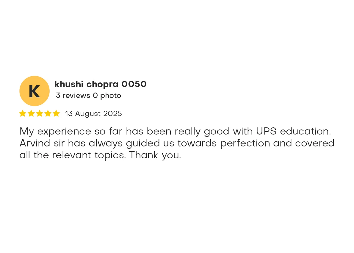 My experience so far has been really good with UPS education. Arvind sir has always guided us towards perfection and covered all the relevant topics. Thank you.