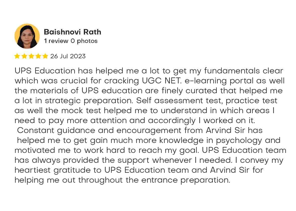UPS Education has helped me a lot to get my fundamentals clear which was crucial for cracking UGC NET. e-learning portal as well the materials of UPS education are finely curated that helped me a lot in strategic preparation. Self assessment test, practice test as well the mock test helped me to understand in which areas I need to pay more attention and accordingly I worked on it. Constant guidance and encouragement from Arvind Sir has helped me to get gain much more knowledge in psychology and motivated me to work hard to reach my goal. UPS Education team has always provided the support whenever I needed. I convey my heartiest gratitude to UPS Education team and Arvind Sir for helping me out throughout the entrance preparation.