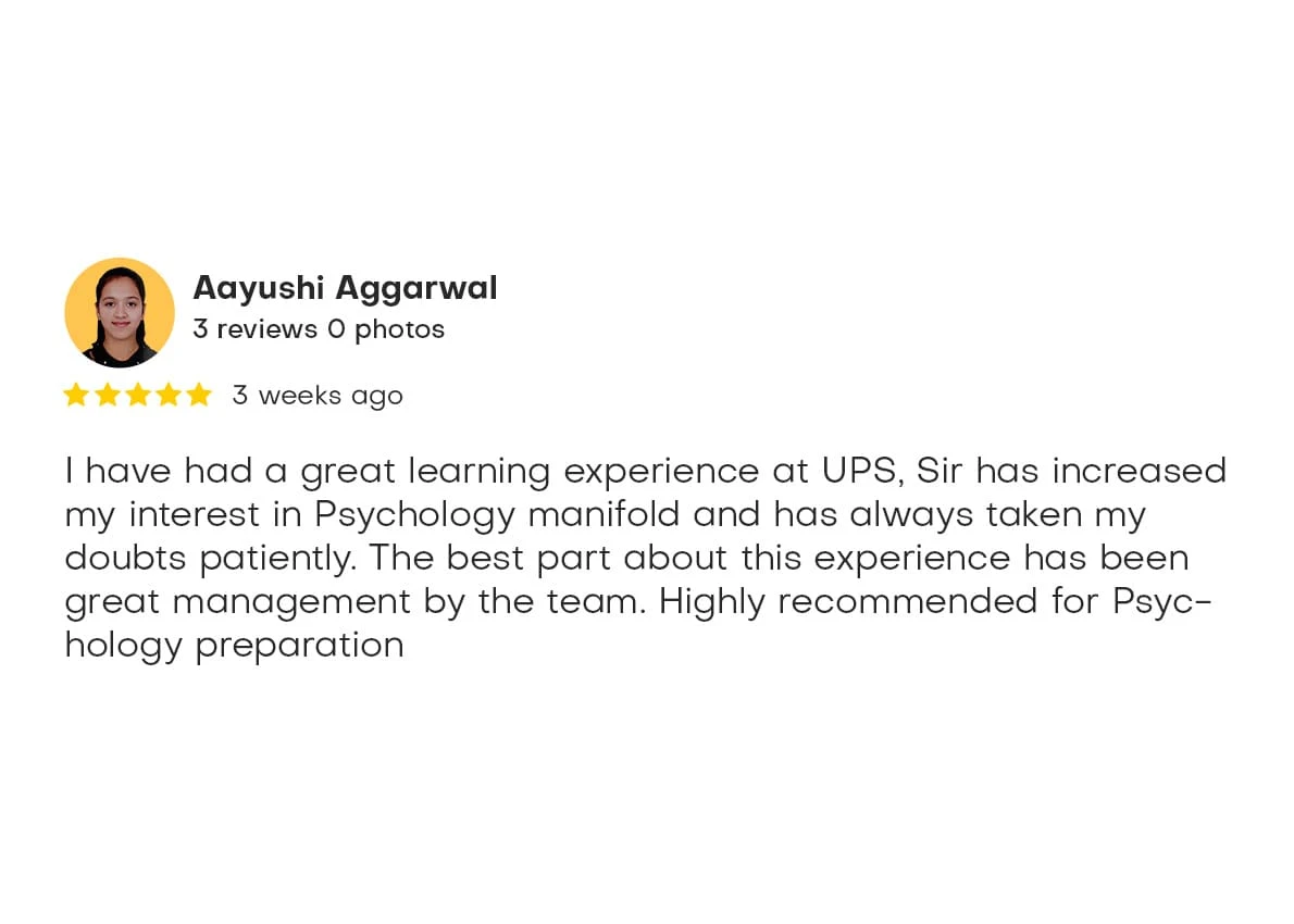 I have had a great learning experience at UPS. Sir has increased my interest in Psychology manifold and has always taken my doubts patiently. The best part about this experience has been great management by the team. Highly recommended for Psychology preparation