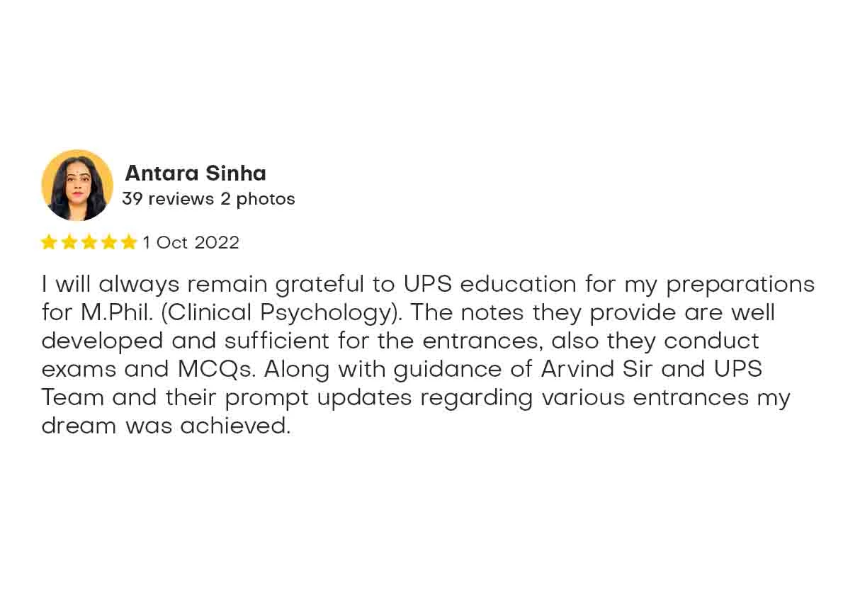 I will always remain grateful to UPS education for my preparations for M.Phil. (Clinical Psychology). The notes they provide are well developed and sufficient for the entrances, also they conduct exams and MCQs. Along with guidance of Arvind Sir and UPS Team and their prompt updates regarding various entrances my dream was achieved.