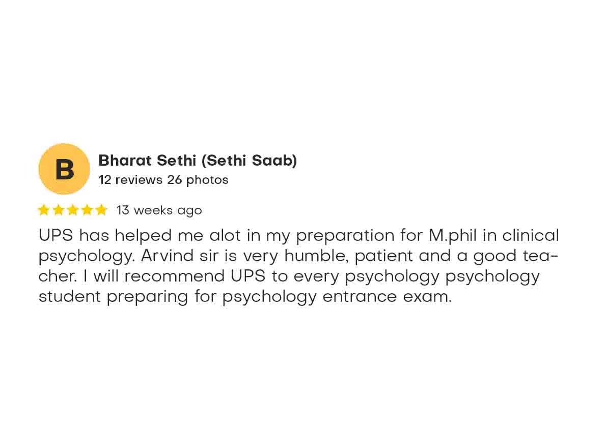 UPS has helped me alot in my preparation for M.phil in clinical psychology. Arvind sir is very humble, patient and a good teacher. I will recommend UPS to every psychology psychology student preparing for psychology entrance exam.