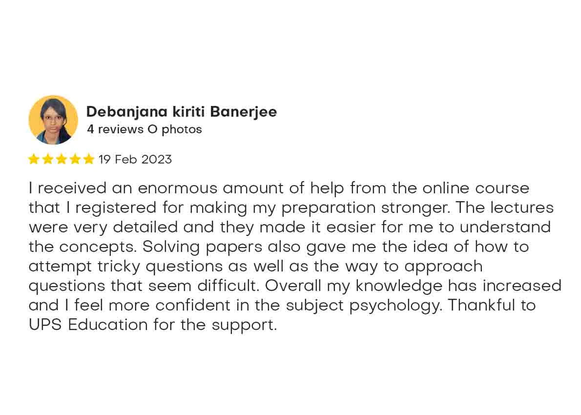 I received an enormous amount of help from the online course that I registered for making my preparation stronger. The lectures were very detailed and they made it easier for me to understand the concepts. Solving papers also gave me the idea of how to attempt tricky questions as well as the way to approach questions that seem difficult. Overall my knowledge has increased and I feel more confident in the subject psychology. Thankful to UPS Education for the support.