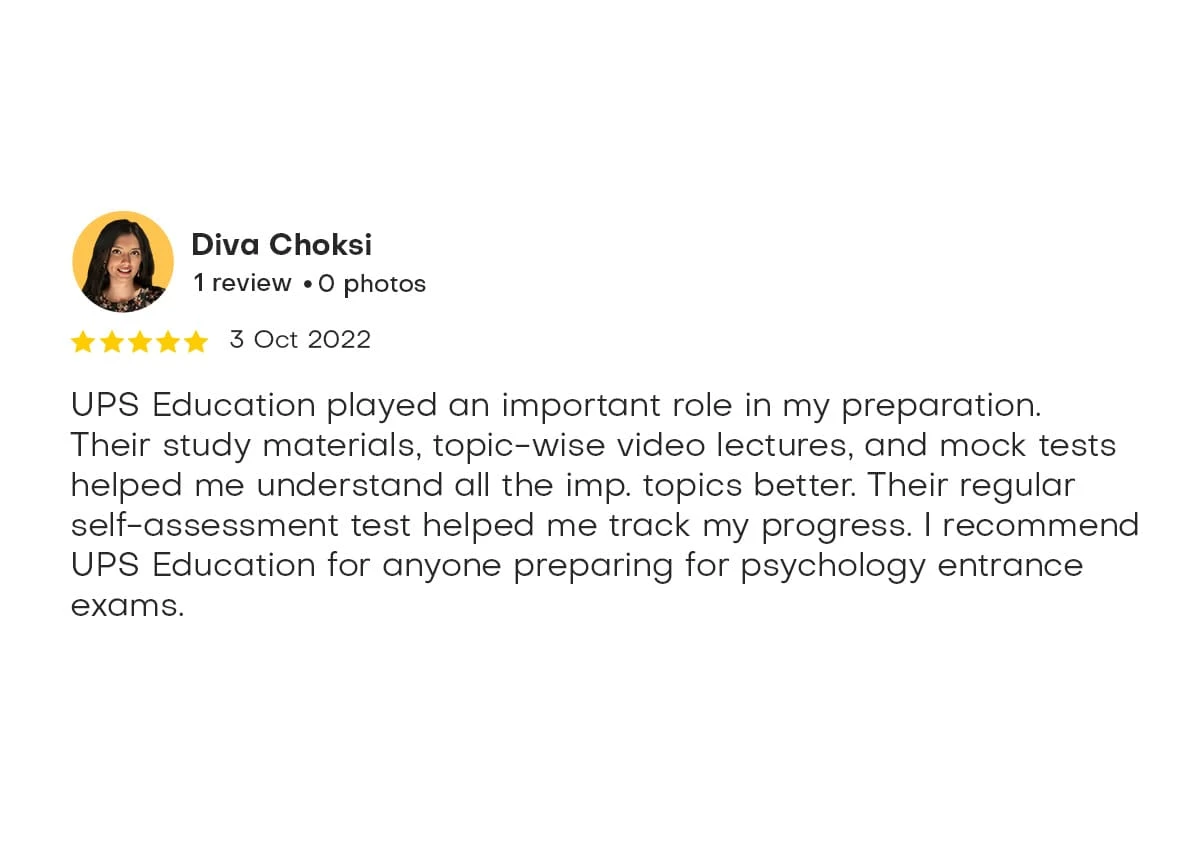 UPS Education played an important role in my preparation. Their study materials, topic-wise video lectures, and mock tests helped me understand all the imp. topics better. Their regular self-assessment test helped me track my progress. I recommend UPS Education for anyone preparing for psychology entrance exams.