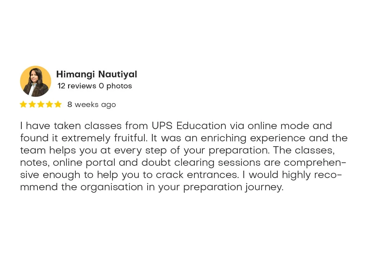 I have taken classes from UPS Education via online mode and found it extremely fruitful. It was an enriching experience and the team helps you at every step of your preparation. The classes, notes, online portal and doubt clearing sessions are comprehensive enough to help you to crack entrances. I would highly recommend the organisation in your preparation journey.