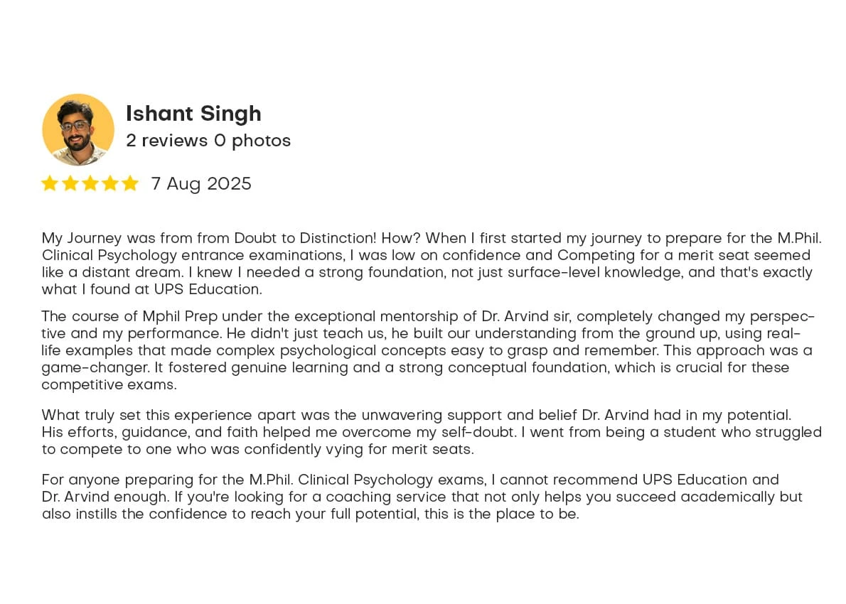 For anyone preparing for the M.Phil. Clinical Psychology exams, I cannot recommend UPS Education and Dr. Arvind enough. If you're looking for a coaching service that not only helps you succeed academically but also instills the confidence to reach your full potential, this is the place to be.