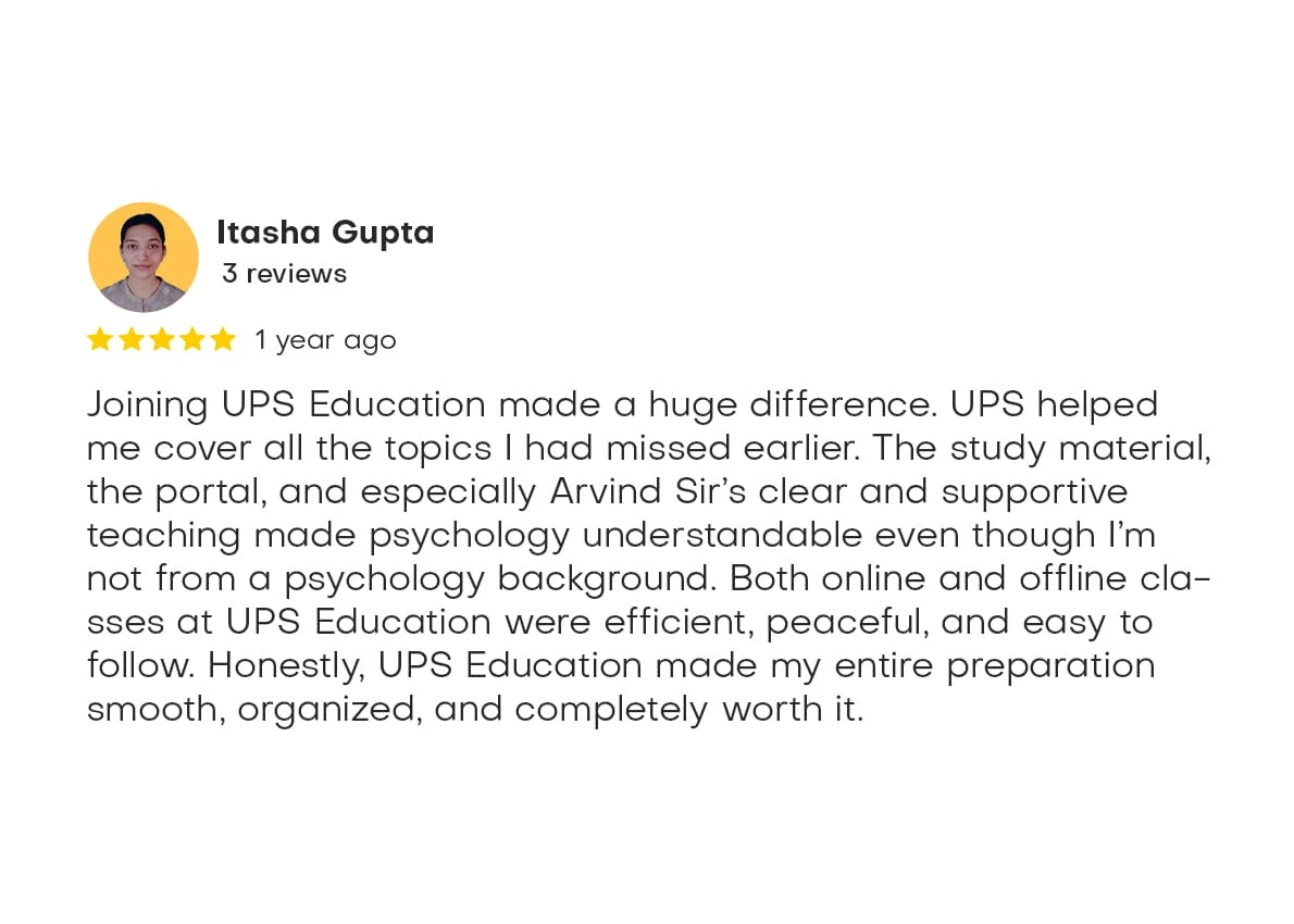 Joining UPS Education made a huge difference. UPS helped me cover all the topics I had missed earlier. The study material, the portal, and especially Arun Sir’s clear and supportive teaching made psychology understandable even though I’m not from a psychology background. Both online and offline classes at UPS Education were efficient, peaceful, and easy to follow. Honestly, UPS Education made my entire preparation smooth, organized, and completely worth it.
