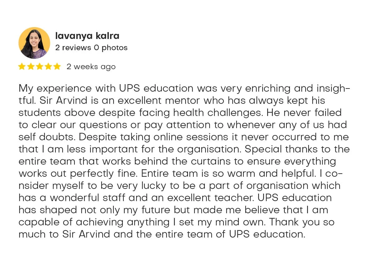 My experience with UPS education was very enriching and insightful. Sir Arvind is an excellent mentor who has always kept his students above despite facing health challenges. He never failed to clear our questions or pay attention to whenever any of us had self doubts. Despite taking online sessions it never occurred to me that I am less important for the organisation. Special thanks to the entire team that works behind the curtains to ensure everything works out perfectly fine. Entire team is so warm and helpful. I consider myself to be very lucky to be a part of organisation which has a wonderful staff and an excellent teacher. UPS education has shaped not only my future but made me believe that I am capable of achieving anything I set my mind own.
