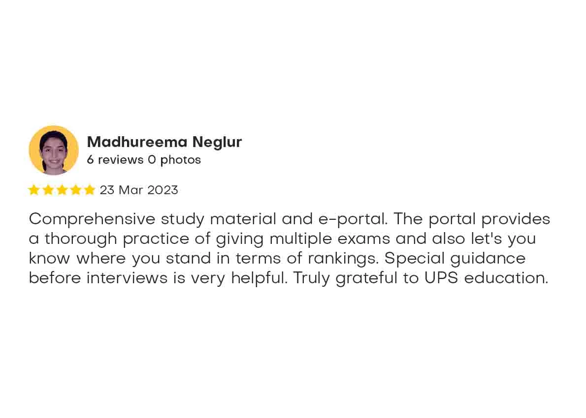 Comprehensive study material and e-portal. The portal provides a thorough practice of giving multiple exams and also lets you know where you stand in terms of rankings. Special guidance before interviews is very helpful. Truly grateful to UPS education 🙏