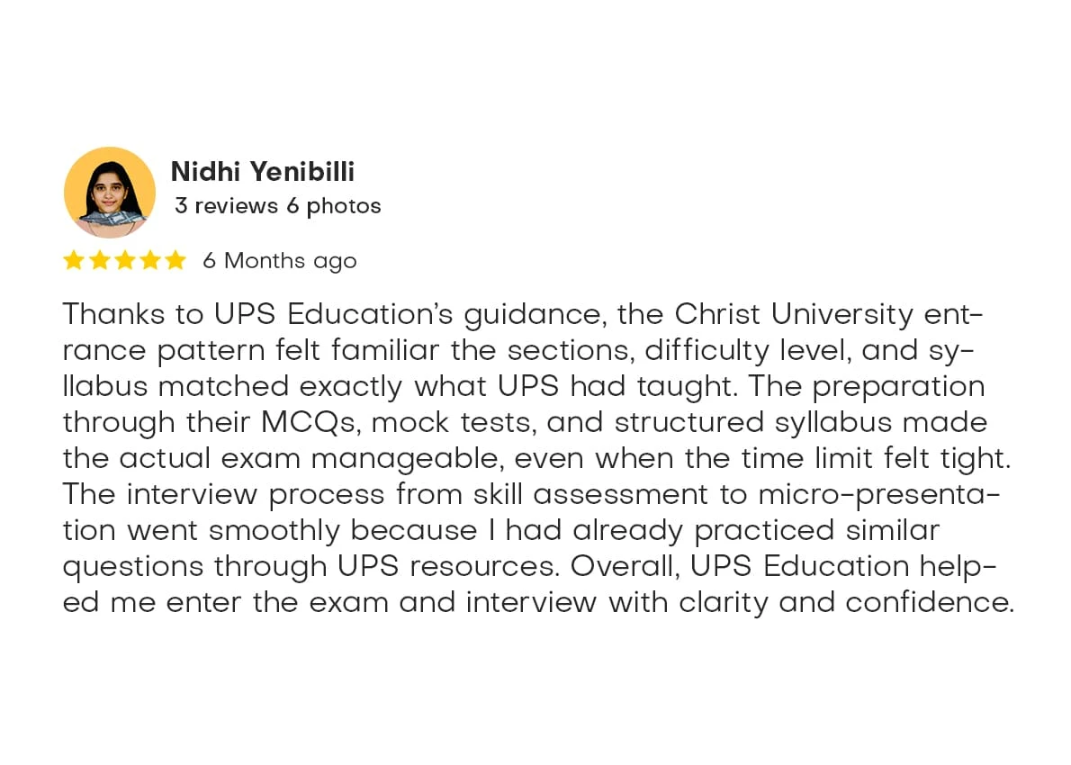 Thanks to UPS Education’s guidance, the Christ University entrance pattern felt familiar the sections, difficulty level, and syllabus matched exactly what UPS had taught. The preparation through their MCQs, mock tests, and structured syllabus made the actual exam manageable, even when the time limit felt tight. The interview process from skill assessment to micro-presentation went smoothly because I had already practiced similar questions through UPS resources. Overall, UPS Education helped me enter the exam and interview with clarity and confidence.