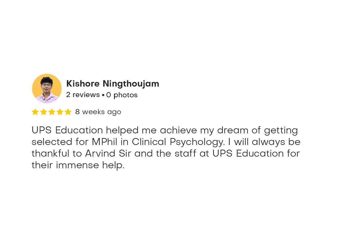 UPS Education helped me achieve my dream of getting selected for MPhil in Clinical Psychology. I will always be thankful to Arvind Sir and the staff at UPS Education for their immense help.