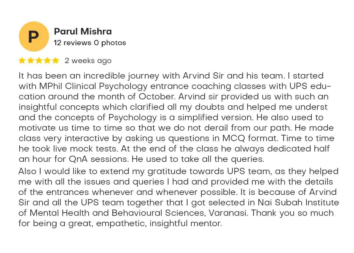 It has been an incredible journey with Arvind Sir and his team. I started with MPhil Clinical Psychology entrance coaching classes with UPS education around the month of October. Arvind sir provided us with such an insightful concepts which clarified all my doubts and helped me understand the concepts of Psychology is a simplified version. He also used to motivate us time to time so that we do not derail from our path. He made class very interactive by asking us questions in MCQ format. Time to time he took live mock tests. At the end of the class he always dedicated half an hour for QnA sessions. He used to take all the queries.