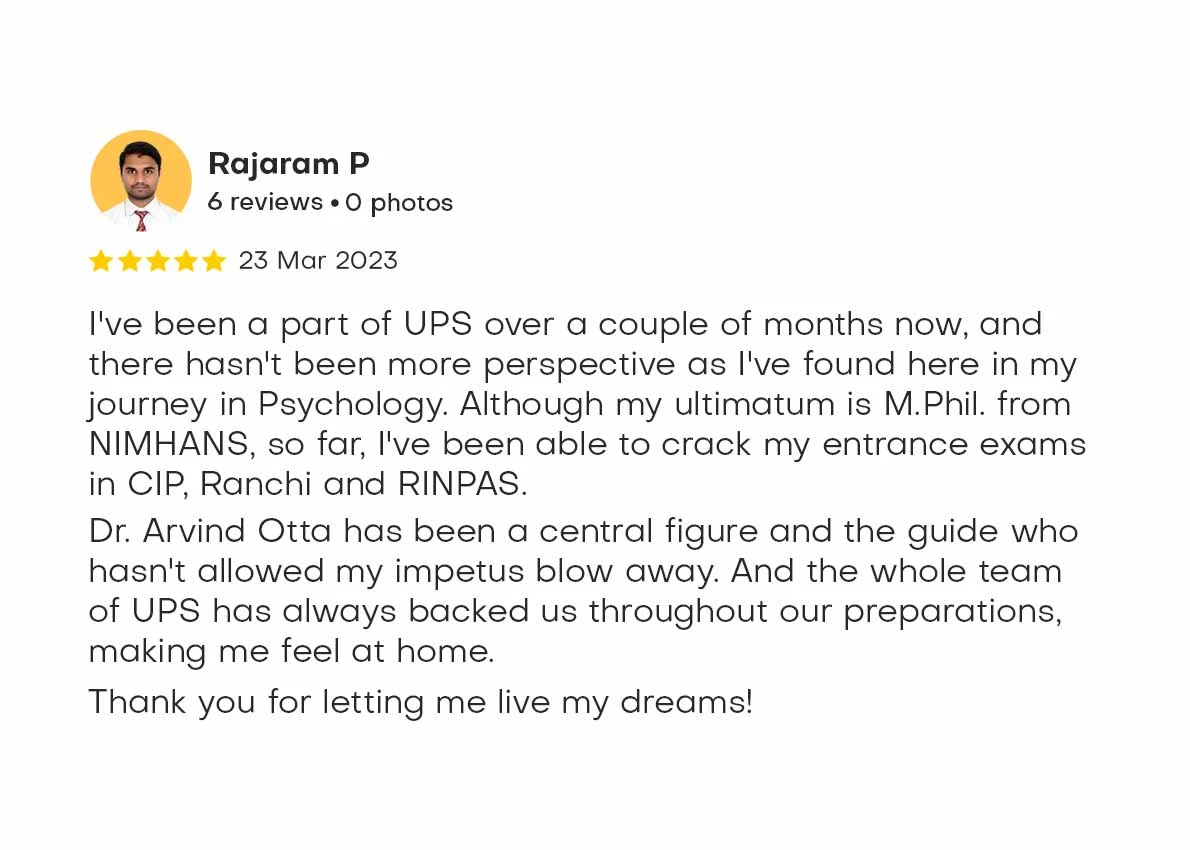 I’ve been a part of UPS over a couple of months now, and there hasn’t been more perspective as I’ve found here in my journey in psychology. Although my ultimatum is M.Phil. from NIMHANS, so far, I’ve been able to crack my entrance exams in CIP, Ranchi, and RINPAS.