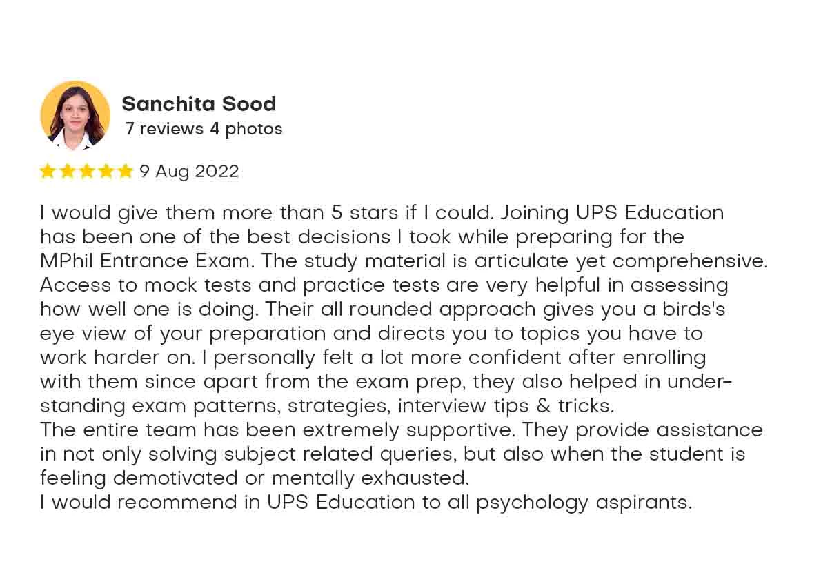 I would give them more than 5 stars if I could. Joining UPS Education has been one of the best decisions I made while preparing for the MPhil Entrance Exam. The study material is articulate yet comprehensive. Access to mock tests and practice tests is very helpful in assessing how well one is doing. Their all-around approach gives you a bird's-eye view of your preparation and directs you to topics you have to work harder on. I felt a lot more confident after enrolling with them since apart from the exam prep, they also helped in understanding exam patterns, strategies, interview tips & tricks.