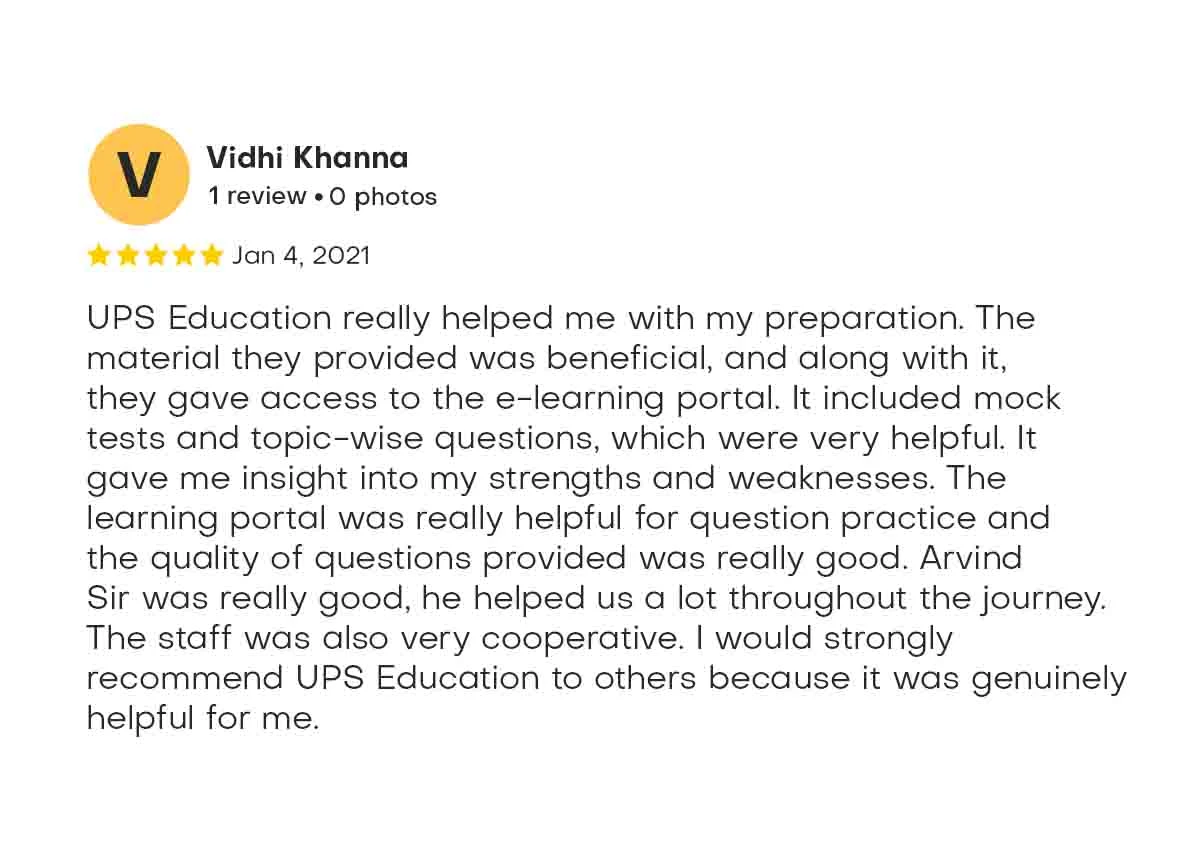 UPS Education really helped me with my preparation. The material they provided was beneficial, and along with it, they gave access to the e-learning portal. It included mock tests and topic-wise questions, which were very helpful. It gave me insight into my strengths and weaknesses. The learning portal was really helpful for question practice and the quality of questions provided was really good. Arvind Sir was really good, he helped us a lot throughout the journey. The staff was also very cooperative. I would strongly recommend UPS Education to others because it was genuinely helpful for me.