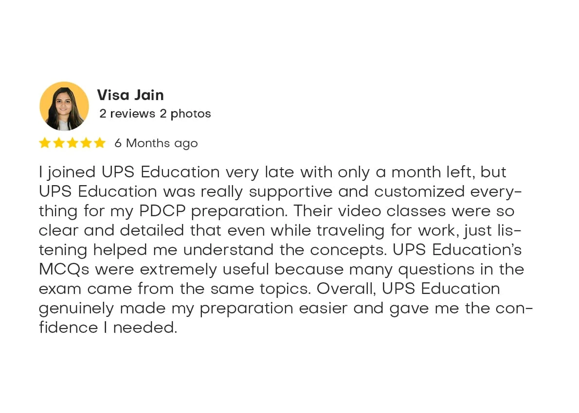 I joined UPS Education very late with only a month left, but UPS Education was really supportive and customized everything for my PDCP preparation. Their video classes were so clear and detailed that even while traveling for work, just listening helped me understand the concepts. UPS Education’s MCQs were extremely useful because many questions in the exam came from the same topics. Overall, UPS Education genuinely made my preparation easier and gave me the confidence I needed.