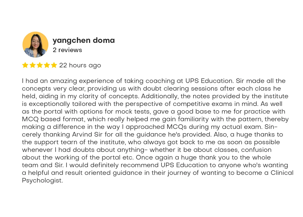 Once again, a heartfelt thank-you to the entire team and Sir. I would definitely recommend UPS Education to anyone seeking reliable, result-oriented guidance on their journey to becoming a Clinical Psychologist. ✨